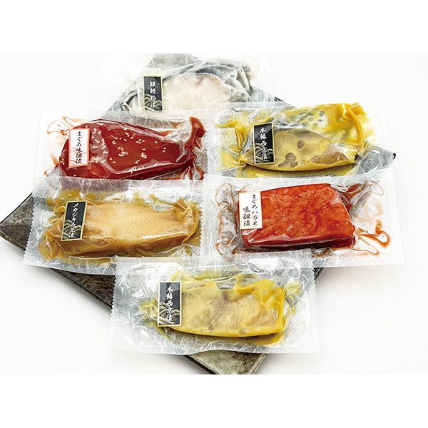 ●内容量:本鰆西京漬80g×2、銀だら粕漬け80g×1、カジキみそ漬80g×1、まぐろみりん漬80g×1、まぐろハラモみりん漬80g×1
