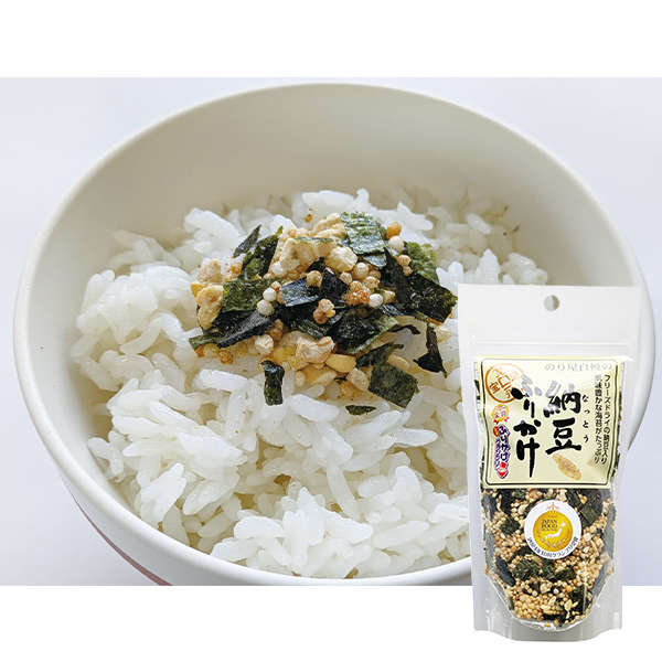 「納豆ふりかけ」フリーズドライのひきわり納豆と風味豊かな 海苔をたっぷりと使用しています。口に含むと納豆特有の粘りが出てきます。